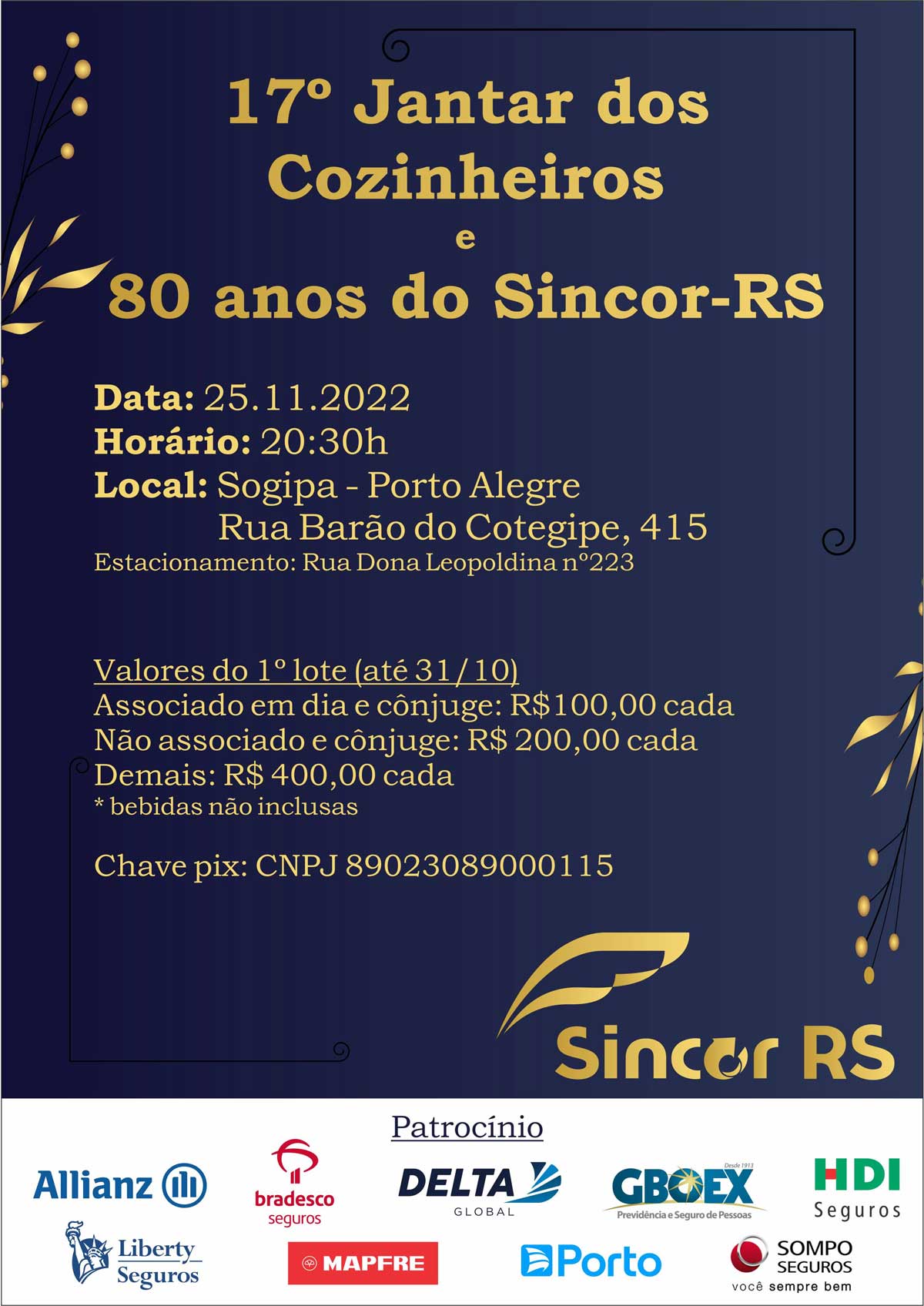 Já foram vendidos mais de 50% do primeiro lote (prazo se encerra em 31/10) de convites para a 17ª edição do tradicional Jantar dos Cozinheiros e em comemoração aos 80 anos do Sincor-RS.